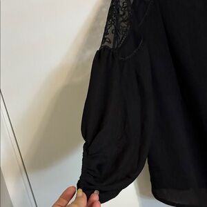 This sheer elegant black top features delicate lace detailing, perfect for any occasion. Its sophisticated design adds a touch of class to your wardrobe.