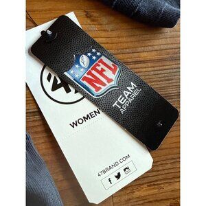 Women's "New England Patriots" Half Moon Stevie Cropped Tee by 47 Brand, official NFL team apparel. Features a graphic print on the front and baby ribbed cuffs. Navy blue color, size Medium, brand new with tags.