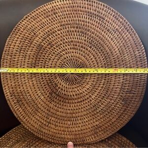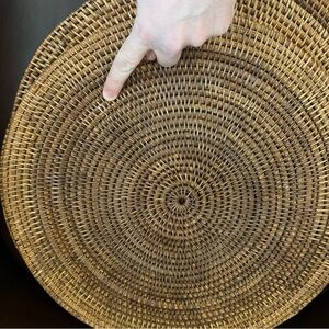 Set of 4 round woven rattan placemats. Natural tan color. Perfect for dining decor.