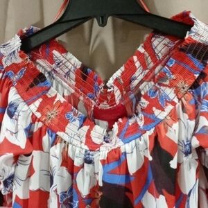 Medium new with tag Jennifer Lopez top elastic neck pulls down over shoulders metal detail on sleeves. This is a very gorgeous top lightweight feels silky made of polyester great for the 4th of july