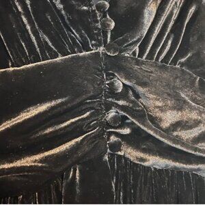 This elegant Anthropologie midi dress features a sophisticated design with buttons on the bodice, adjustable smocked back, lush black velvet, and a side zipper.