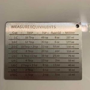 A stainless steel magnet featuring measurement equivalents! Perfect to use when cooking and baking.