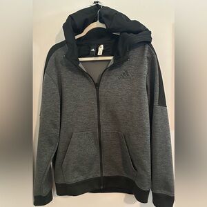 Classic Adidas men’s jacket in gray with black accents. Features the iconic three-stripe design on the sleeves and a full-zip front. Made with breathable, lightweight material that’s perfect for layering, workouts, or casual everyday wear. Just missing the strings. Barely worn & in great pre-loved condition! No pilling, holes, tears, or stains!