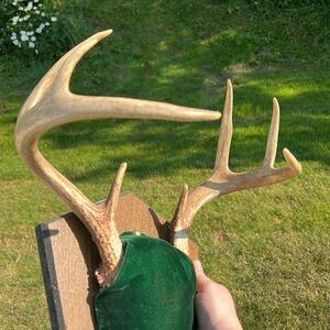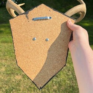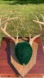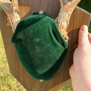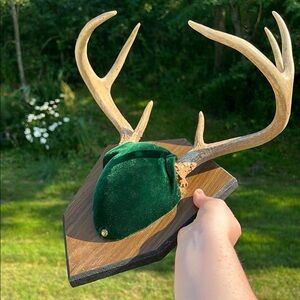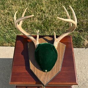 Unique wall decor featuring 8 point antlers on a green velvet wood base. Perfect for adding a rustic touch to any room. 13” width of the rack and the plaque is 11.5x9” approximately. Some minor wear and small spot on velvet as shown. Cannot be bundled due to its shape / size.