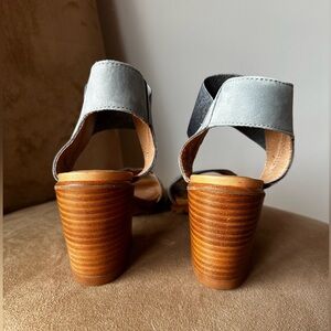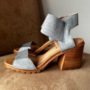 Keywords: Sorel sandals, leather sandals, block heels, ankle strap, dusty blue, grey, modern, comfortable, traction sole, summer shoes, casual chic, versatile