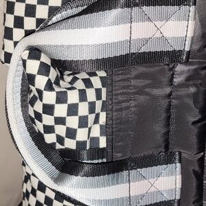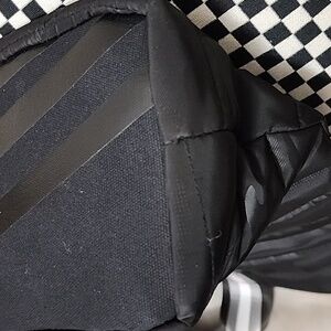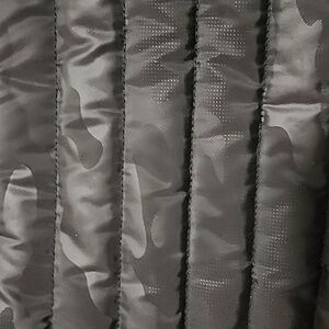 Stylish and versatile black camouflage nylon quilted women's tote bag. Perfect for everyday use. Adjustable/detachable striped striped. One inner zip closure pocket and two slip-in pockets. Snap top closure.
