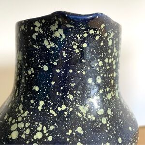Vintage faience style enameled dark blue pottery jug green splatter farmhouse. Unique piece with a faience (tin glaze) feel to it. Outer glaze is darkest blue, with a citrusy green splatter. No visible marks.