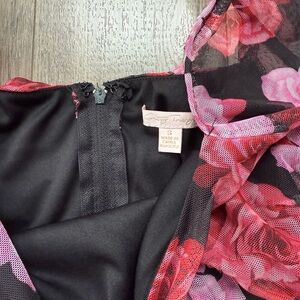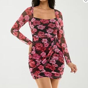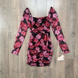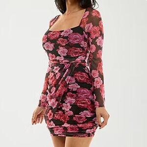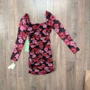 Chic floral dress with vibrant pink and red blooms. Long sleeves and fitted silhouette. Perfect for stylish occasions, new with tags.