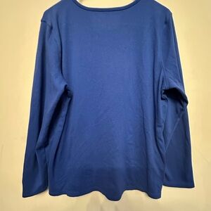 A beautiful cobalt blue top featuring a vibrant red cardinal perched among sequin-embellished winter flowers — a meaningful symbol of loved ones visiting during the holidays ✨