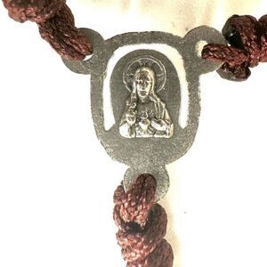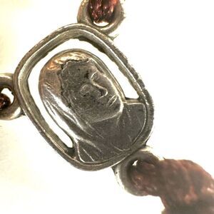 A large medallion of a praying Mary hangs from the bottom while a smaller medallion separates the first pearl bead from the rest of the rosary. This ornate rosary will look lovely swaying from your car mirror
