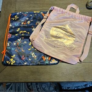 Charming pink Cinderella bag with gold logo. Navy bag with playful Disney character prints. Ideal for travel.Both bags are used in good pre-loved condition. Please see pictures for any inperfections. Boys bag is a Disney cruise bag and girls is from the Disneyland.