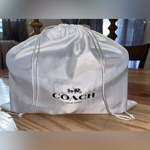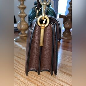 Sophisticated Coach shoulder bag in the colors Brass/Maple. Features a striking gold-tone 'C' clasp. Size of the bag is 10in wide and 6inches tall. Comes with a removable strap and also a crossbody strap. The crossbody strap is 44inches long and the other strap is 17inches long. It has a small red dot in the interior (not sure from what). This bag has been used but overall is in great condition.