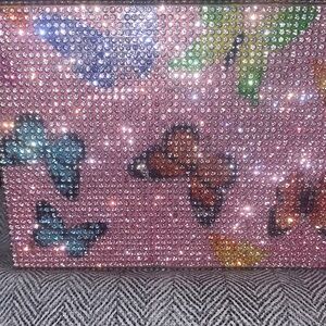 This elegant pink clutch bag features a vibrant butterfly design, perfect for adding a touch of whimsy to any outfit. Ideal for evening events or special occasions.