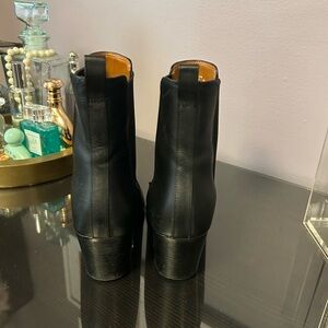 Stylish leather boots with a sleek black exterior. Soft tan interior for added comfort.