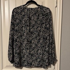 Chic blouse with a floral design. Features a dark green and gray color scheme. Ideal for versatile styling.