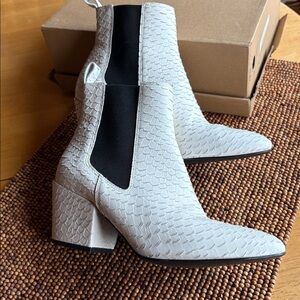 Boots are pull on. White fish scale pattern. Made in Brazil. Covered heels at 3” too high for me. Only worn 2-3 times no scuffs, tears etc. excellent condition
