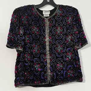 Chiffon woven fabric, semi-sheer, lightweight fabric that drapes beautifully. Open neckline. Tie front. Tropical palms print. Measures 57” from shoulder. 100% polyester