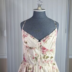 Tiers of printed florals fall gently from a corseted bodice, complete with a lace-up back. Ruffle details and a leg slit add to the romantic aesthetic. By V. Chapman This item is part of our limited edition Garden Floral Bridesmaids collection. Style #65274649 Fit Information See Size Guide measurements for detailed sizing information Built-in bust support; no bra required Size 6 measures 41" from shoulder to hem Product Details Back zip Cotton; polyester and spandex lining Professionally clean Imported