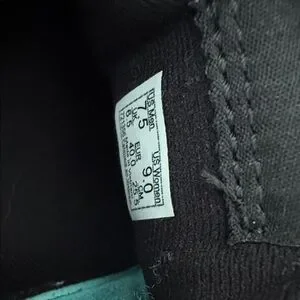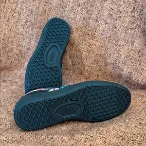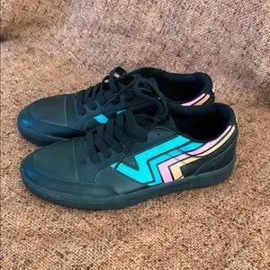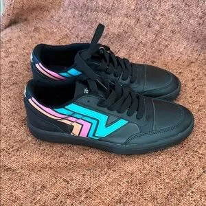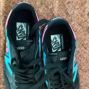 Stylish Vans sneakers. Black base with vibrant pink and blue accents. Perfect for casual wear.