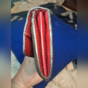 Stylish brown monogram wallet with gold button detail.