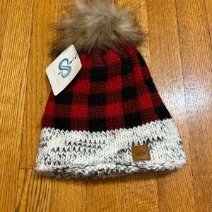 Infinity Raine Red and Black Plaid Beanie with Faux Fur Pom