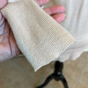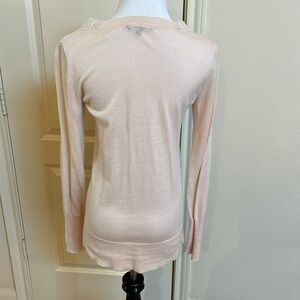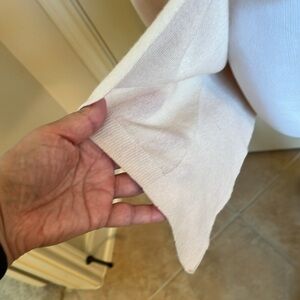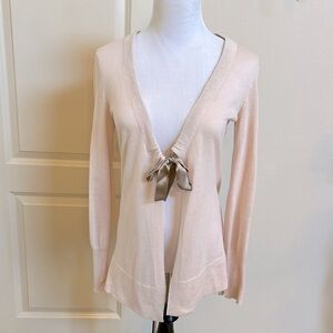 This is a light delicate sweater, goes with everything. Ribbon tie in front. No pilling, odors, holes tears fading.