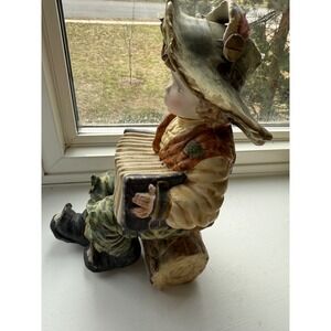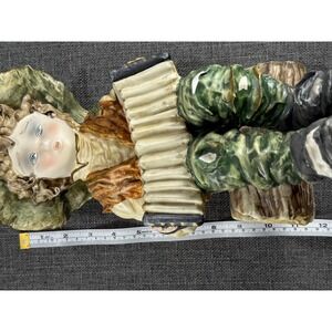 Captivate with this charming Italian porcelain figurine of a young boy joyfully playing his accordion. His wide-brimmed hat, adorned with subtle color accents, and the intricately detailed vest and patched pants evoke a rustic, heartwarming scene. The gentle tilt of his head and expressive blue eyes convey a sense of innocence and musical passion, making him a delightful addition to any collection. This piece is perfect for adding a touch of old-world charm to a mantelpiece, bookshelf, or as a unique decorative accent for a music room or child's nursery.