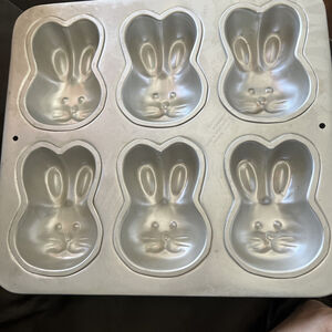 This is a Wilton cake pan in the shape of a bunny head and ears, model number 2105-4426. It was made in Indonesia and is made of aluminum. The pan can make six mini cakes in the shape of Easter rabbits. It was released in 1992 and has since been retired. This pan is a collectible item and a great addition to any kitchen or home bakeware collection.