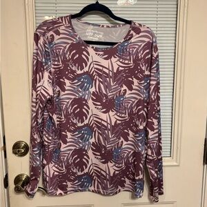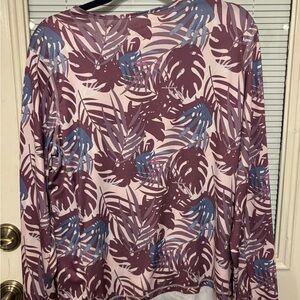 Stylish long sleeve top with a mauve and blue leaf pattern. Perfect for everyday wear.