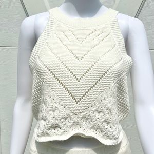 Elegant cream skirt set. Features intricate knit design. Perfect for stylish occasions.