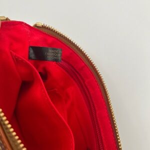 Stylish navy wristlet with brown accents. Features a zip closure and logo detail. Perfect for on-the-go use.