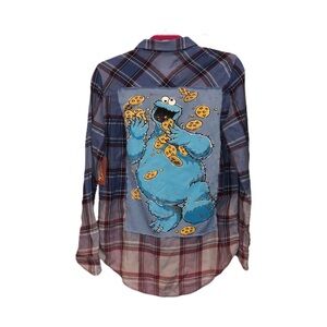 Pink, Purple, Blue Plaid Button Down W/ Cookie Monster Back Patch