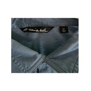 Keywords: Travis Mathew polo, Mens golf shirt, Palm tree print, Striped polo, Blue polo shirt, Casual wear, Summer shirt, Beach vibes, Performance fabric, Short sleeve polo, Athleisure