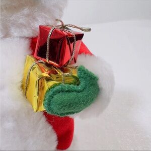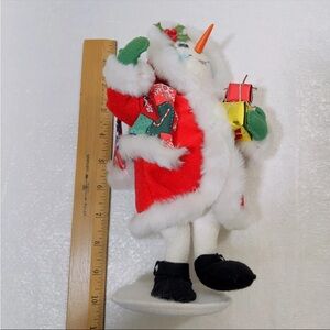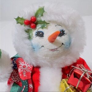 Charming snowman figurine holding colorful gifts. Features a red scarf and green mittens.