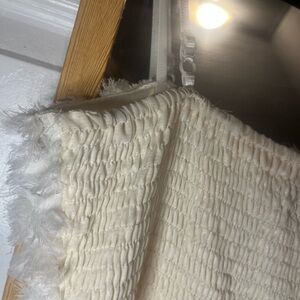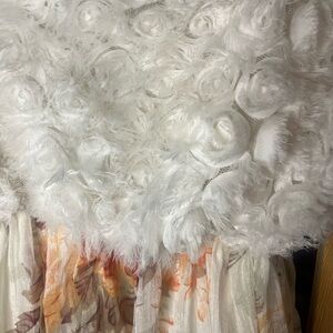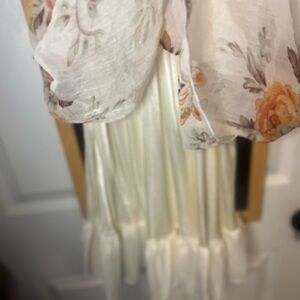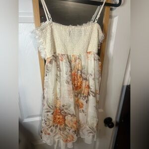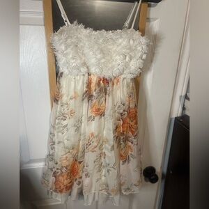 Very cute and limited edition babydoll style dress. Features a cream lining layer, and a floral print with a white top that has little rose-inspired designs throughout. Short length, with adjustable straps. Very minimal wear as pictured.