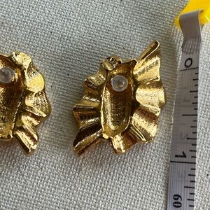 Stunning and unique, these vintage earrings feature a textured gold-tone ruffle design with a shimmery golden enamel center. The glitter detail adds just the right amount of sparkle, making them perfect for both everyday glam and special occasions.