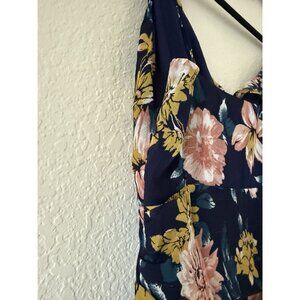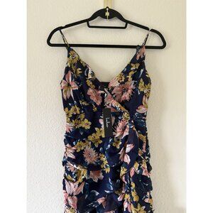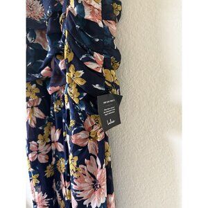 New Lulus Soiree Navy Blue Floral Print Ruched Midi Dress Size XS. Woven chiffon, with metallic threading and yellow and pink floral print, shapes this dress that has adjustable spaghetti straps, a ruffled surplice neckline, and a fitted bodice. Ruching accents the drop waist atop a column midi skirt with a front slit. Hidden side zipper. Length 52in, pit to pit 16in. Still on site for $82.