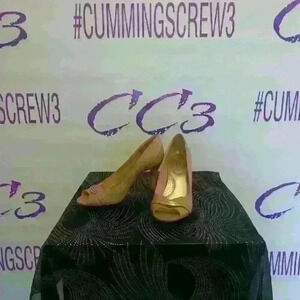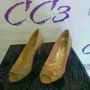Gold and beige high heel women's pumps for sale. deflex comfort. Gold hardware. cushioned soul. All man-made material. made in Vietnam. women's size US 9 and 1/2 e u r 42 UK 8
