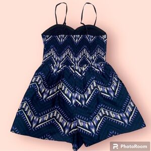 Small black, blue, and white patterned romper featuring pockets, a structured sweetheart neckline, adjustable straps, and accordion stretch on the back.