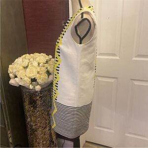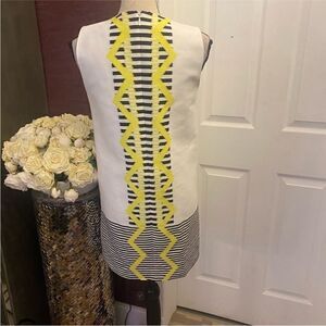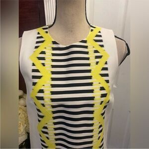 Bold mini dress with striking black stripes and vibrant yellow zigzag accents. Eye-catching and stylish. New, no tags