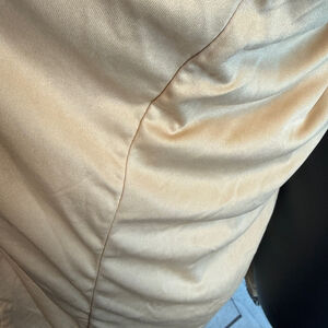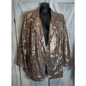 This is a women's ELOQUII plus size 28 blazer, new with tags. The blazer is covered in rose gold sequins, giving it a shimmering appearance. It features a notched lapel, two front pockets, and a single-button closure. The interior is lined with a smooth, light tan fabric. The main material is 100% nylon, with a 100% polyester lining. The back of the blazer is also fully sequined.