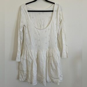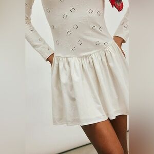 Measurements laying flat: L- Armpit to armpit 18”, Length 33” XL- armpit to armpit 19”, length 35” Laser-cut floral and embossed botanicals make this long-sleeve, drop-waist mini dress absolutely irresistible. Fit: Mini length, drop-waist Features: Boat neckline, long fitted sleeves, laser-cut and embossed details, scooped back, gathered drop-waist poplin skirt Why We Love It: The perfect base for an instant outfit that's as sweet as it is effortless. Care + Content Machine Wash Cold Import 100% Cotton