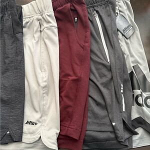Bundle of athletic shorts in gray and burgundy. Comfortable and stylish for workouts.