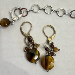 TIGERS EYE Stone Beaded NECKLACE Vtg Brown Dangle Pierced EARRINGS Set