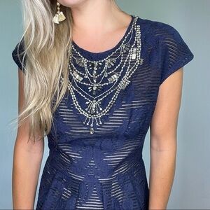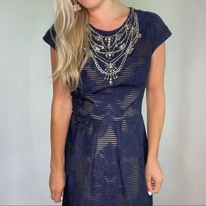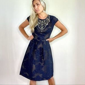 Lela Rose Navy Blue dress with Jeweled embroidered Necklace. A Line/ fit & flare Full Skirt Dress
