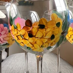 Set of 6 hand-painted wine glasses with vibrant floral designs. Features pink, yellow, blue, and green colors. Beautiful! They all have the same design, which is the pink and yellow flowers then yellow flowers, then blue. I turned them around so you could see all of the beautiful colors. Measurements are approximately 3 1/2 inches wide by 8 inches tall.