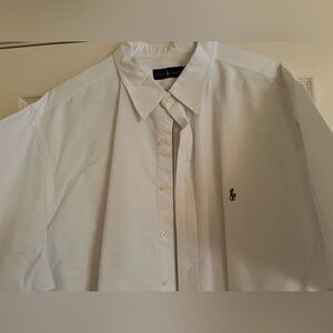 Ralph Lauren Men’s White Short Sleeve Button Down Shirt 3XB. Has been dry cleaned as noted by the colored tag in the bottom button hole.