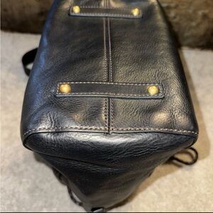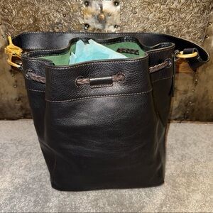 Drawstring Bag with beautiful tanned glove leather lining and green suede collar. Braided drawstring closure, one interior zippered pocket, two slip pockets, one cell phone pocket, key keeper, and feet. There are some scratches which are inherent with Florentine leather and minor imperfections. Please see pictures for condition.