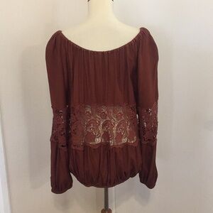 This is a free people top. Middle band is a crochet material that can be seen through. Extremely stretchy band of elastic in wrists and waists. Tassel drawstring on neck line. Burnt orange color. Loose fitting. Good used condition. No known flaws. Measures 22 inches across the bust and is about 26 inches in length. Price is firm. Thanks for looking.