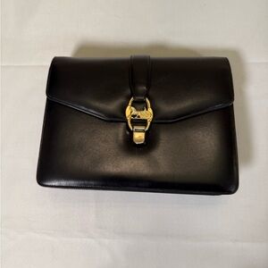 Gorgeous authentic vintage Céline shoulder bag featuring the iconic gold Horse & Chariot clasp. Classic black box leather, structured silhouette, dual interior compartments, and adjustable strap. Made in Italy.